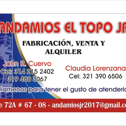 En ANDAMIOS EL TOPO JR, somos una empresa especializada en el alquiler y venta de andamios, comprometidos con ofrecer soluciones seguras y eficientes para la construcción, mantenimiento e industria en general. Contamos con una amplia variedad de andamios diseñados para adaptarse a cualquier tipo de proyecto, garantizando calidad, resistencia y cumplimiento de normativas de seguridad.